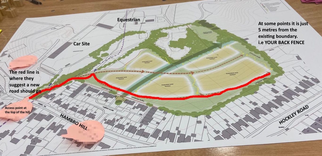 We are getting feedback from a lot of Hambro Hill and Hockley Road residents that didn’t go to the developers meeting and that is they simply don’t realise how close the access road (and houses/flats) will be to their back fence (5 metres). So all of those houses will have a road at the back as well as the front if this madness isn't stopped! The residents on the opposite side of Hockley Road, will see those new buildings instead of the horses they currently see from their front bedroom windows.